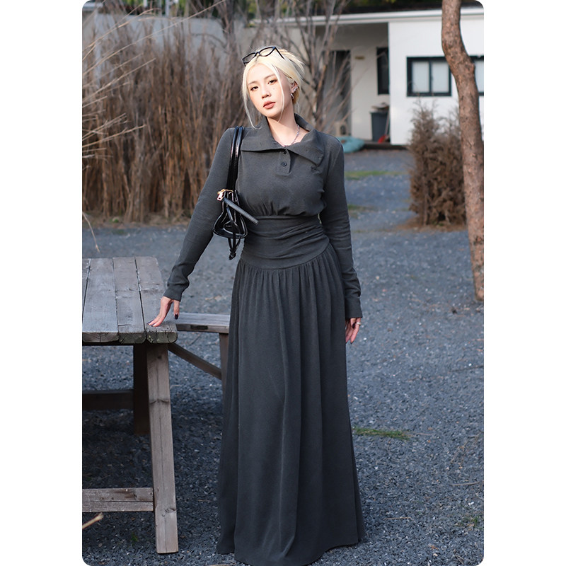 胖mm秋冬显瘦针织连衣裙木子理想大码女装半开襟收腰长袖长裙子