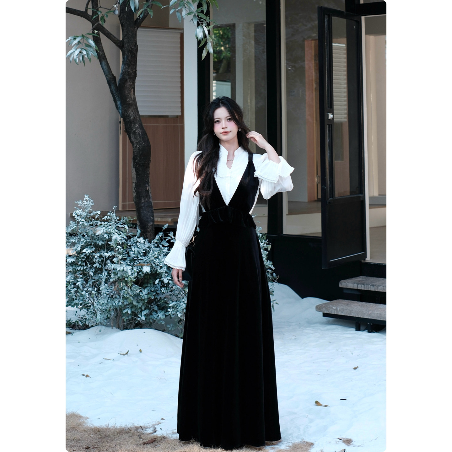 糯米子[奥法庄园]假两件连衣裙秋冬微胖大码丝绒长裙显瘦收腰裙子