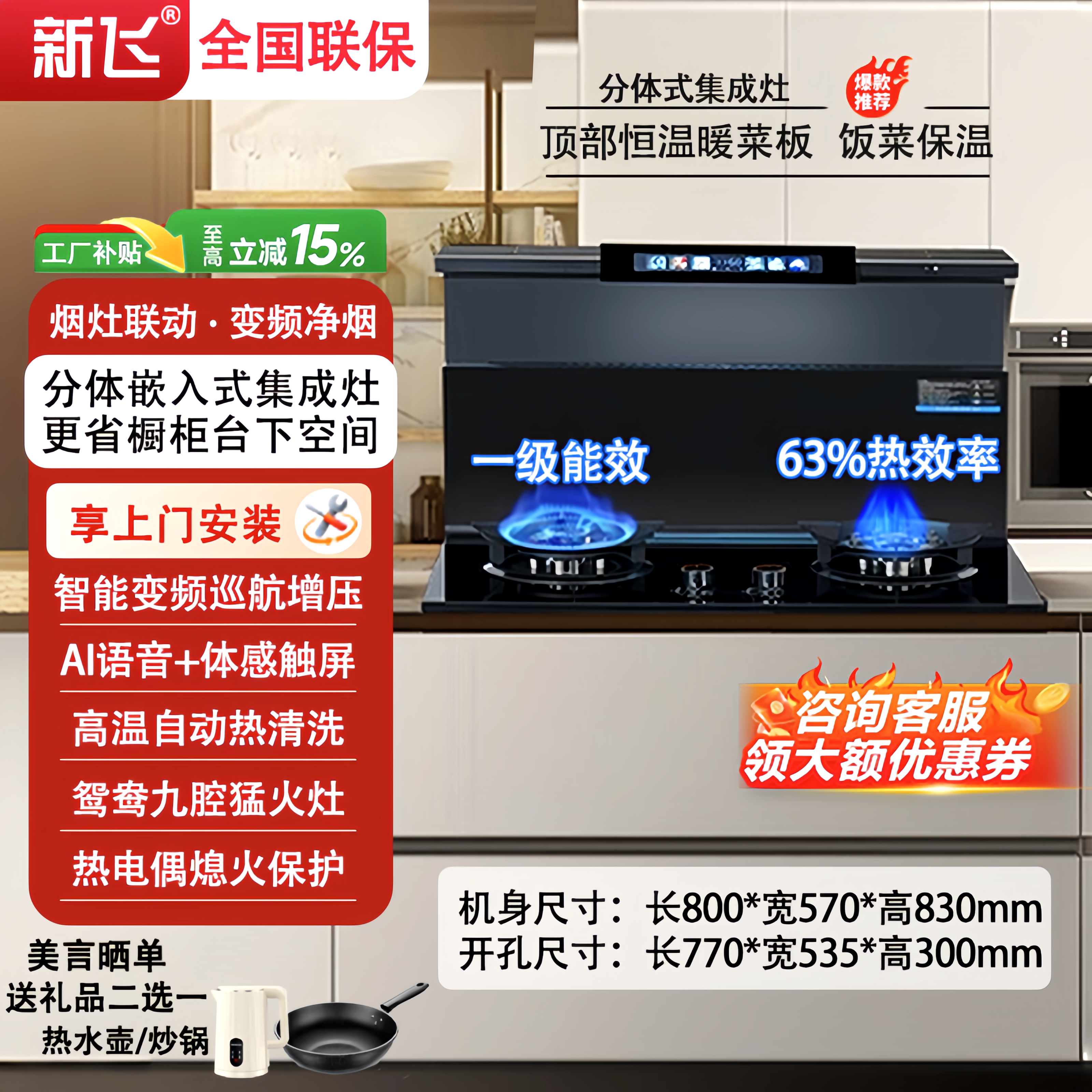 新飞家用厨房分体式集成灶烟灶联动变频大吸力智能触屏侧吸下排式
