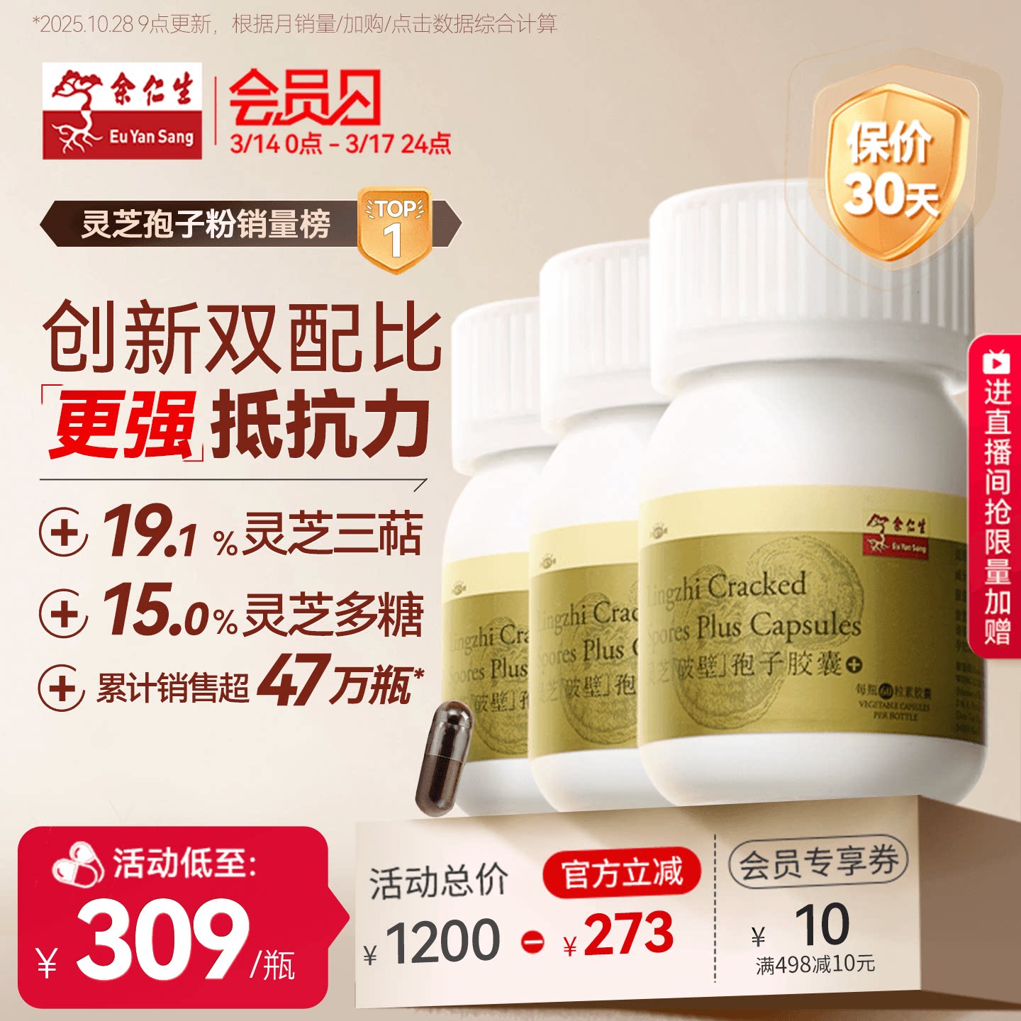 余仁生固淳破壁灵芝孢子粉胶囊官方旗舰店灵芝孢子月套餐90粒*2瓶
