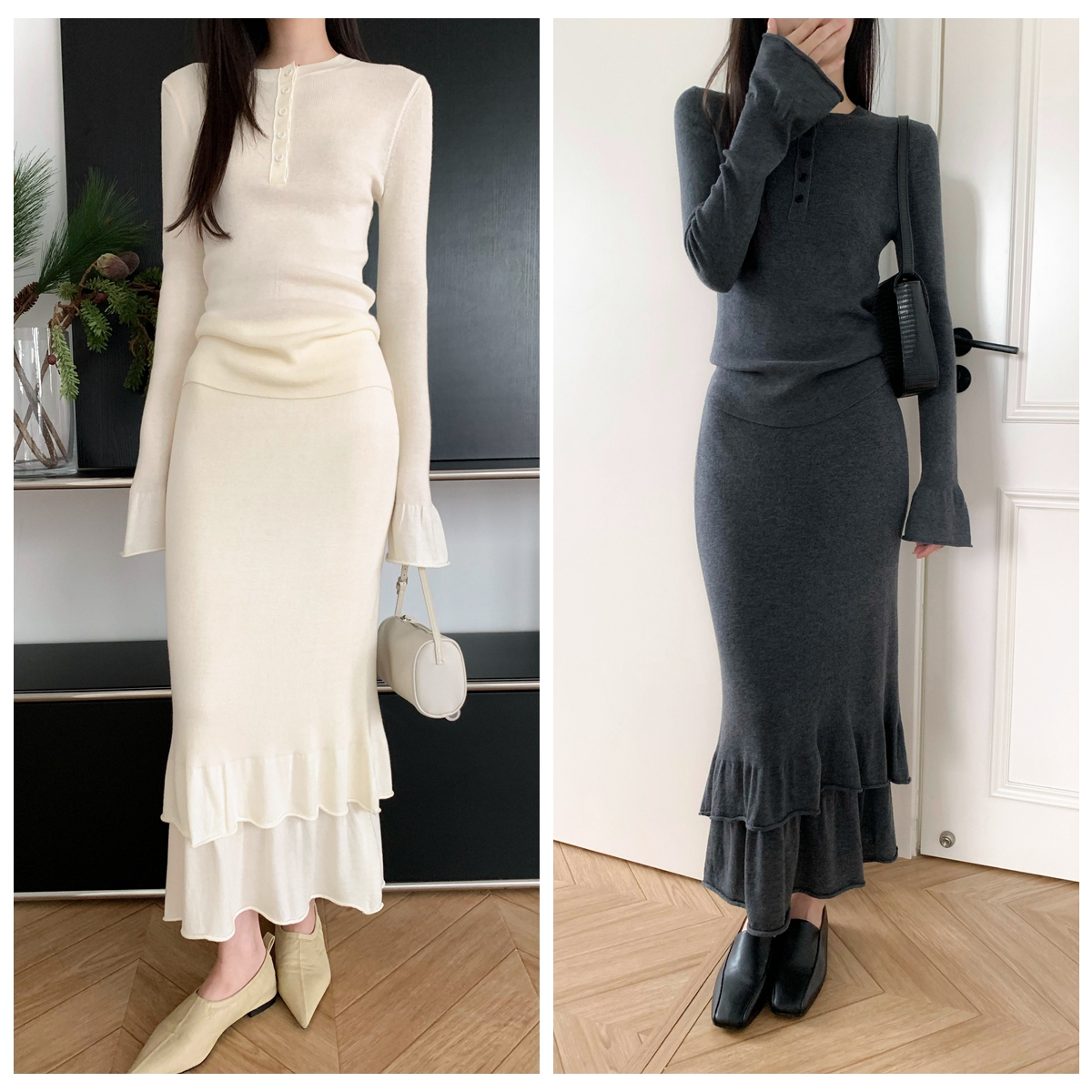 自留私服 两件套复古亨利领蛋糕袖打底/双层蛋糕花边半裙秋冬套装