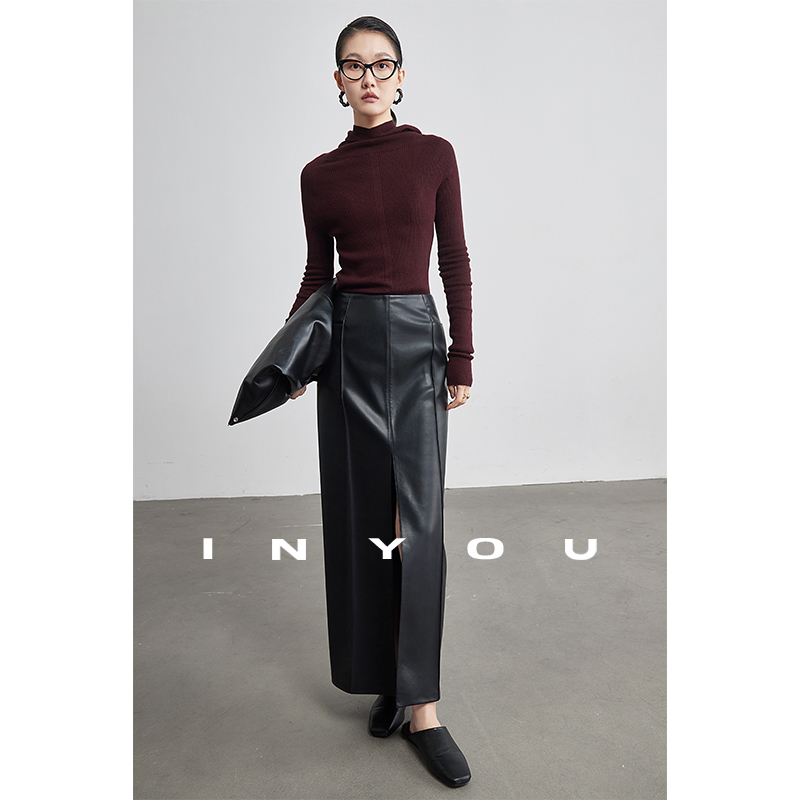 因由 高腰PU皮裙直筒半裙秋冬新款开叉设计感时尚长款显瘦半身裙