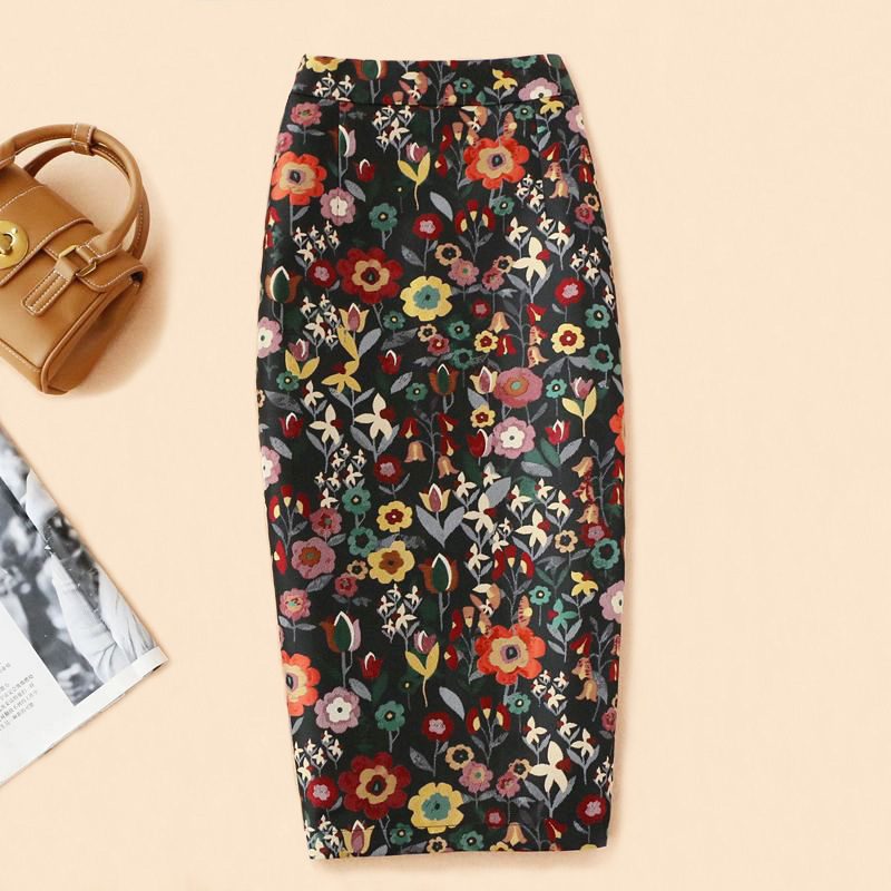 复古刺绣半身裙女长款碎花一步包臀裙中长包裙花色半裙秋冬花长裙