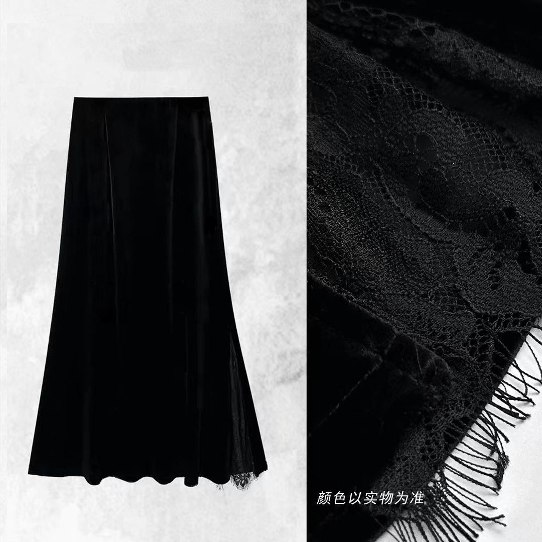2025中国风刺绣蕾丝显瘦半裙秋冬百搭半裙黑色丝绒半裙开叉丝绒裙