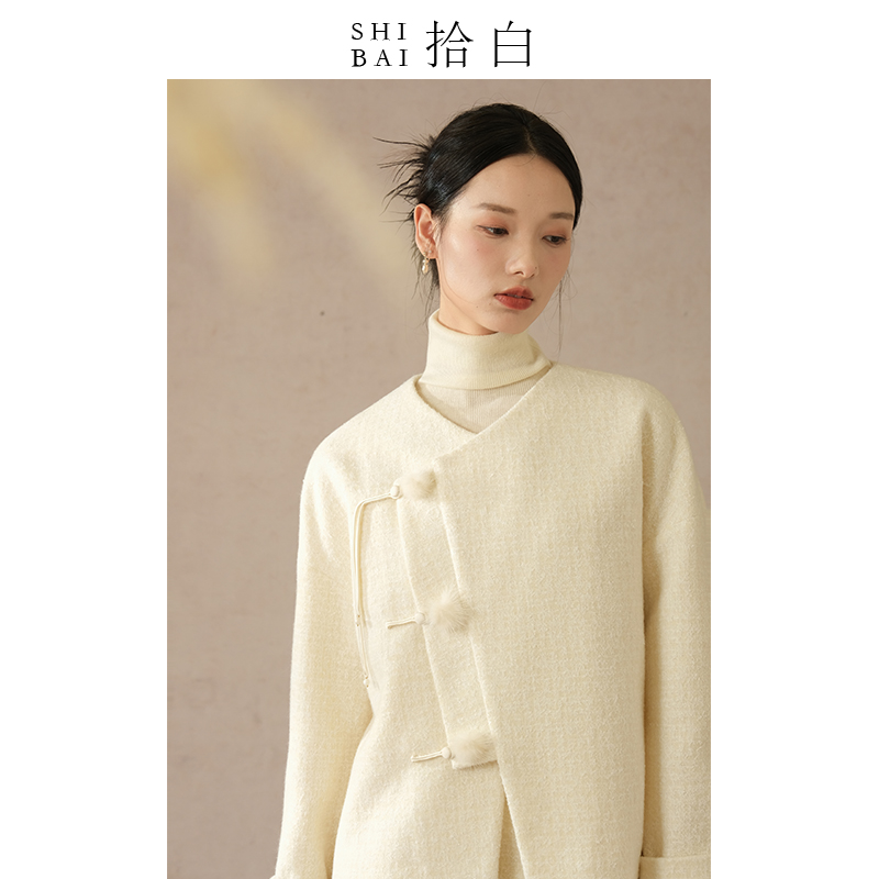 SHIBAI拾白新中式提花套装原创国风女装米白色毛呢外套半裙秋冬