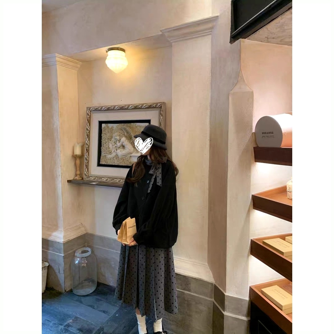 高腰压褶波点半裙秋冬新款时工作室原创暗黑千金黑色毛呢花苞外套