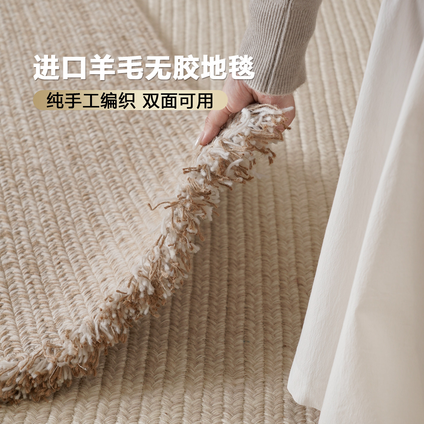古臻手工编织无胶羊毛地毯 素色亚麻客厅家用高级床边卧室流苏毯