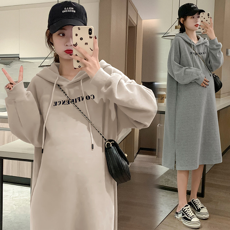 孕妇春装连衣裙新款韩版孕妇装宽松连帽卫衣裙大码中长款春秋裙子