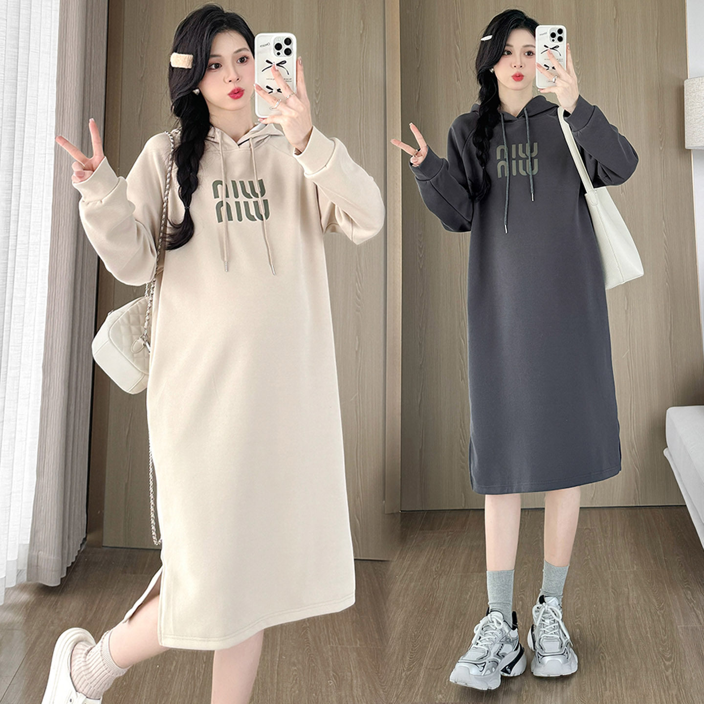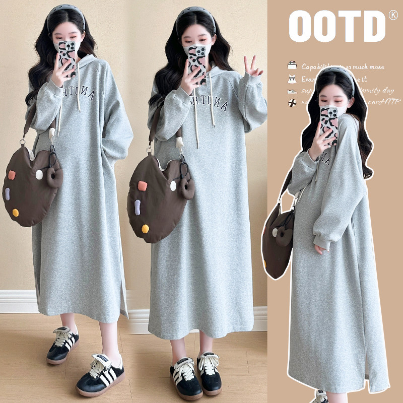 孕妇春装连衣裙2026新款宽松大码连帽过膝卫衣裙遮肚开叉春秋裙子