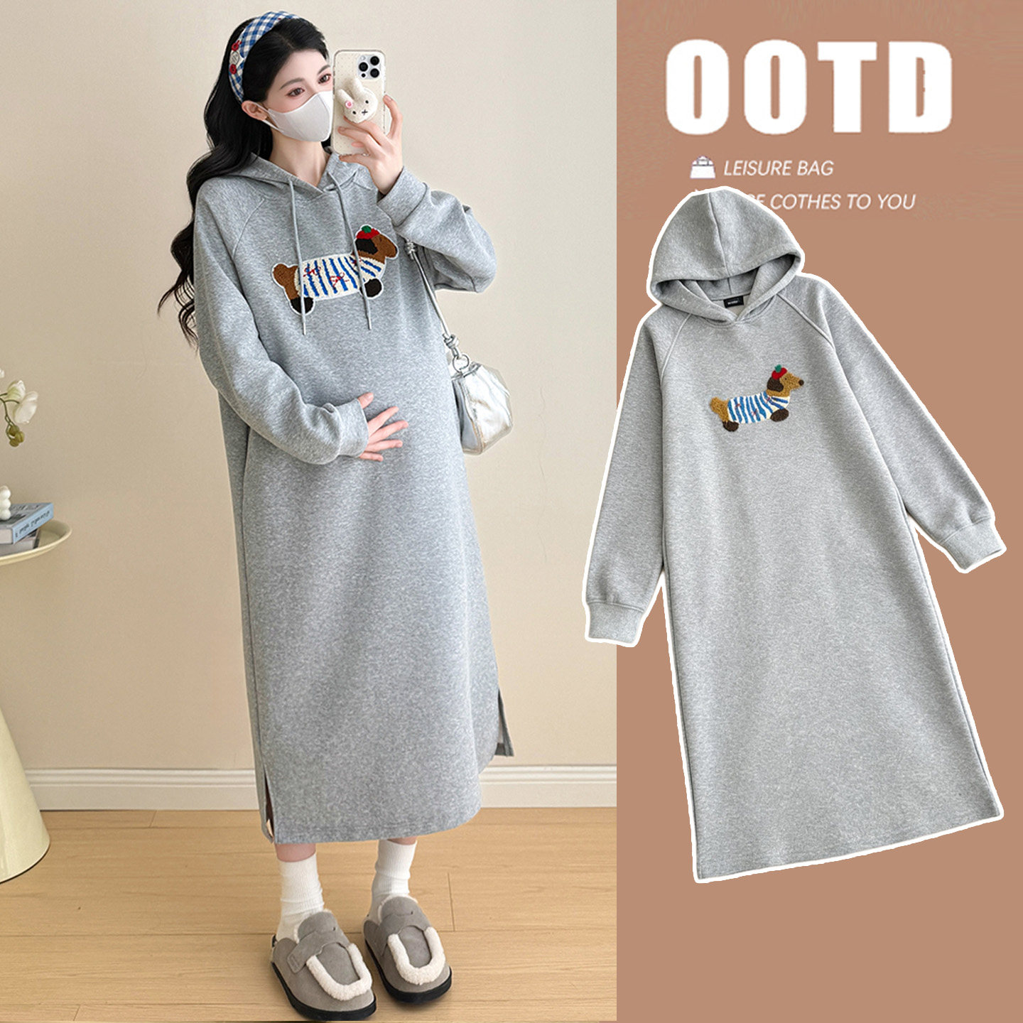 2026孕妇春装连衣裙新款刺绣连帽过膝长裙春秋卫衣裙网红辣妈裙子
