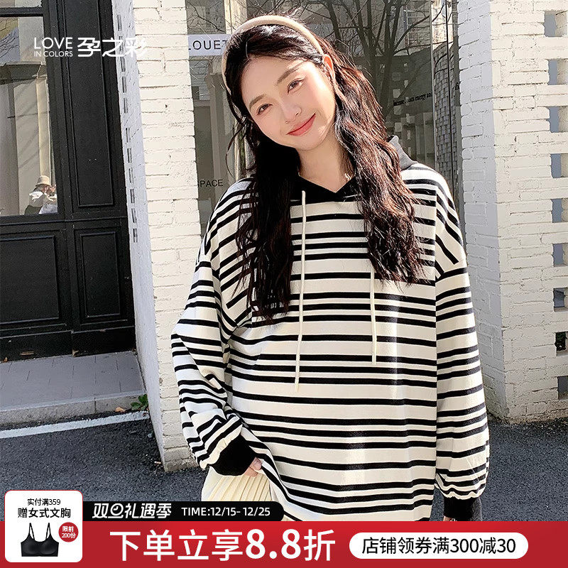孕之彩孕妇春装2025年新款慵懒风宽松条纹连帽上衣中长款休闲卫衣