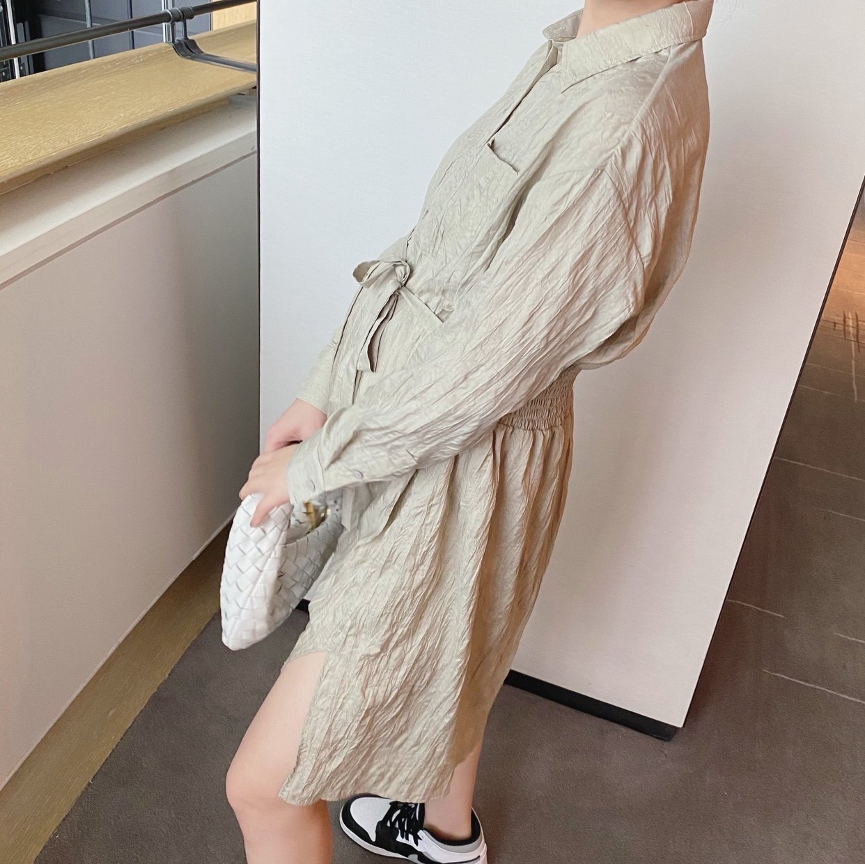 LeoMami 孕妇春装连衣裙时尚款褶皱设计感纯棉收腰系带裙子孕装潮