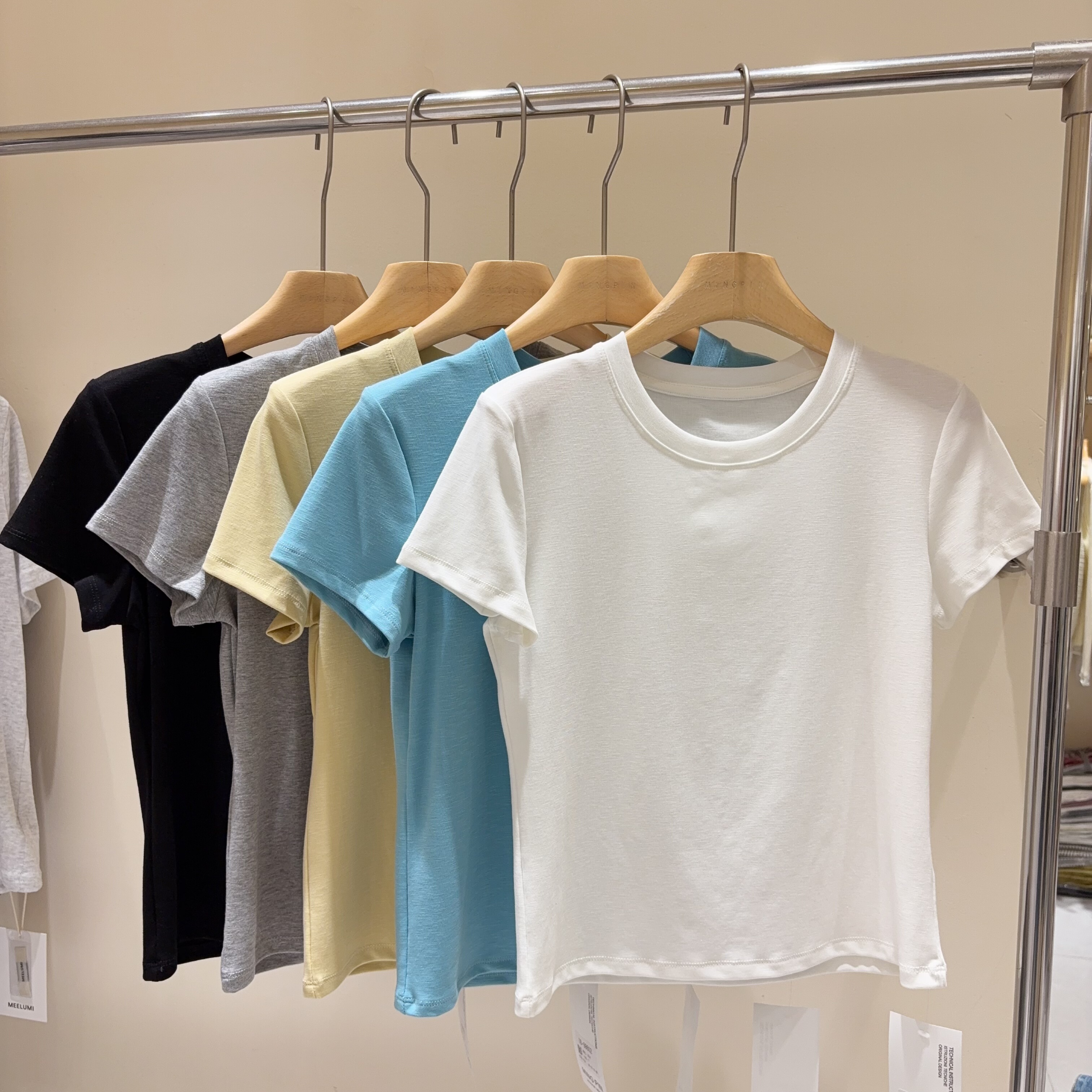 2026夏基础款纯色洋气小圆领T恤女短袖修身纯棉百搭紧身打底上衣