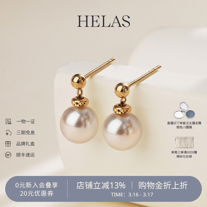 HELAS赫拉官方正品Akoya海水车花珍珠耳钉女珍珠耳饰耳环18k黄金