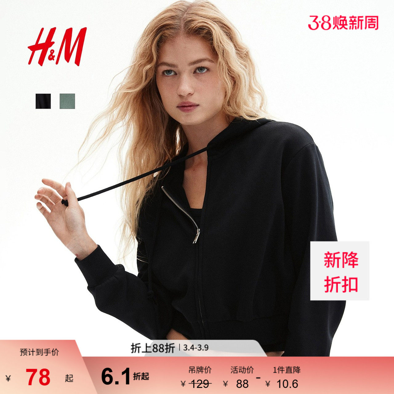 HM女装卫衣2026春季新款美式开衫大廓形连帽衫拉链外套1234775