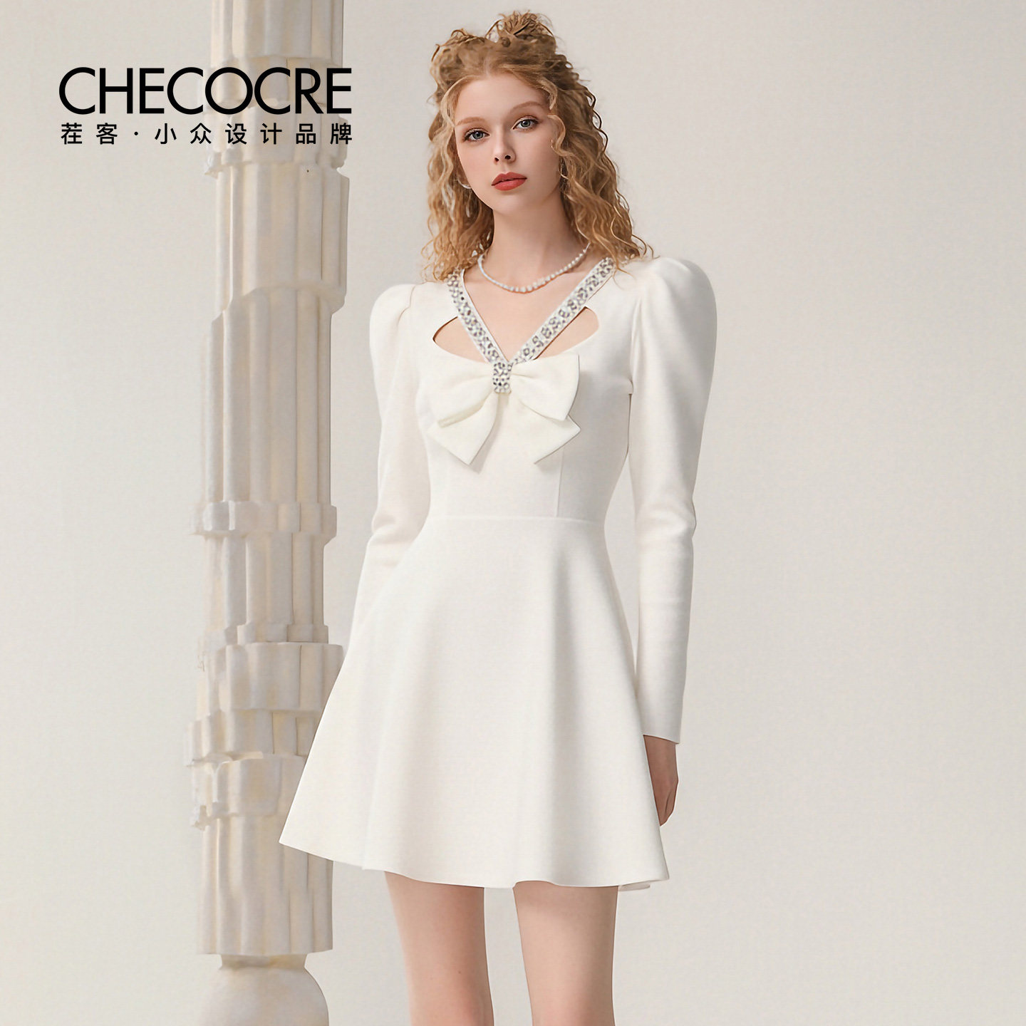 茬客【暮色沙滩】法式甜系公主风连衣裙25秋冬V领钻饰蝴蝶结短裙