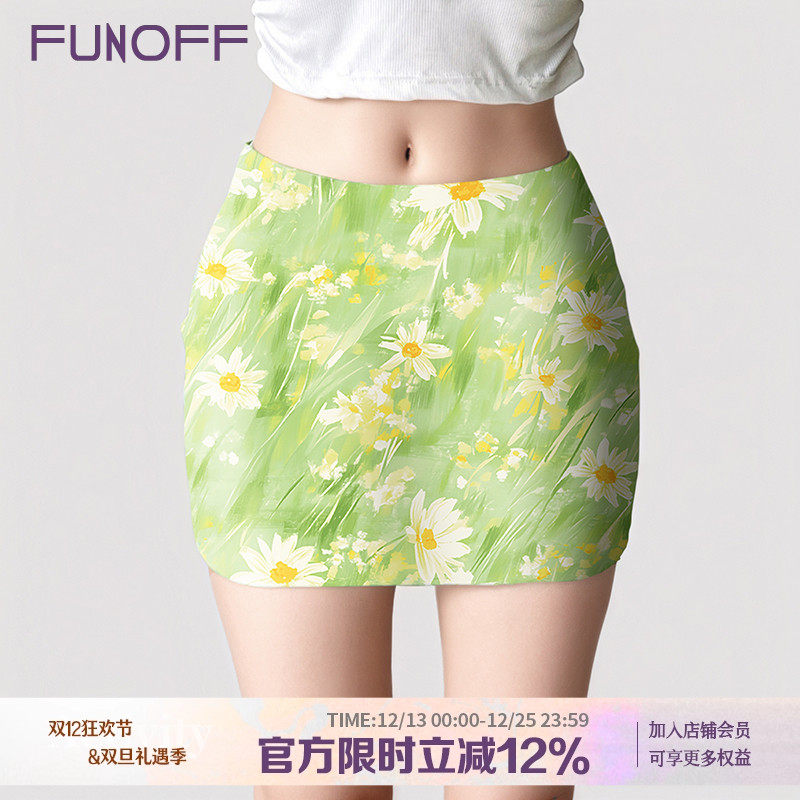 FUNOFF 夏日沙滩雏菊绿色油画印花半身裙度假风低腰性感包臀短裙