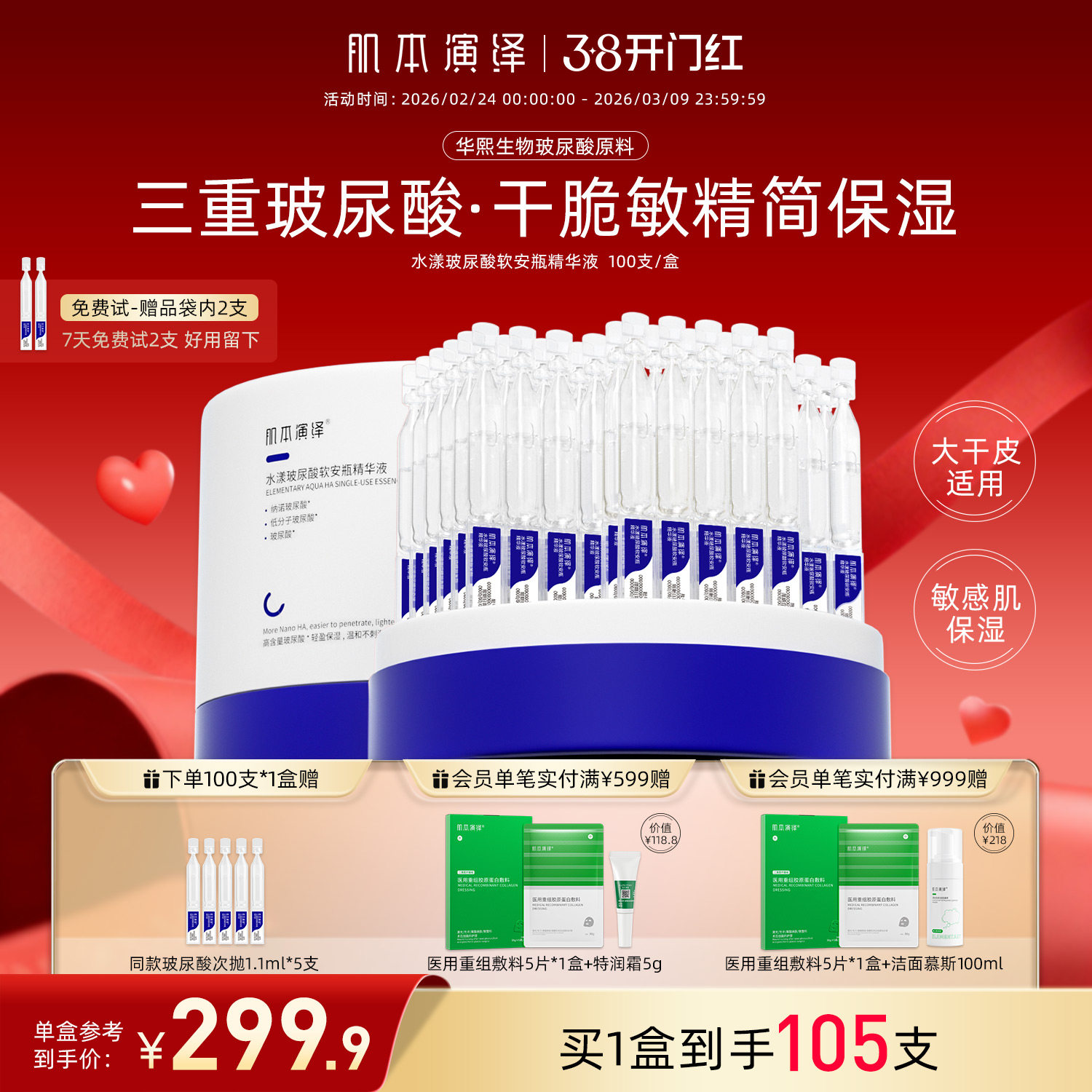 肌本演绎小蓝支100支补水保湿玻尿酸原液干敏皮次抛软安瓶精华液