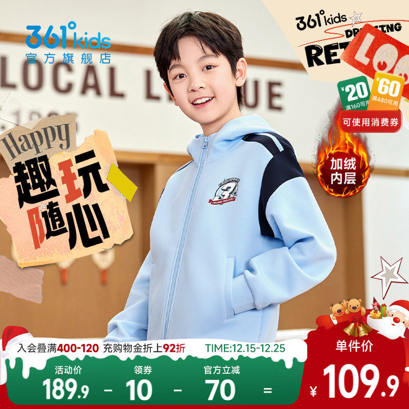 361°童装男童连帽针织外套2025新款春秋加绒学院运动中大童外套
