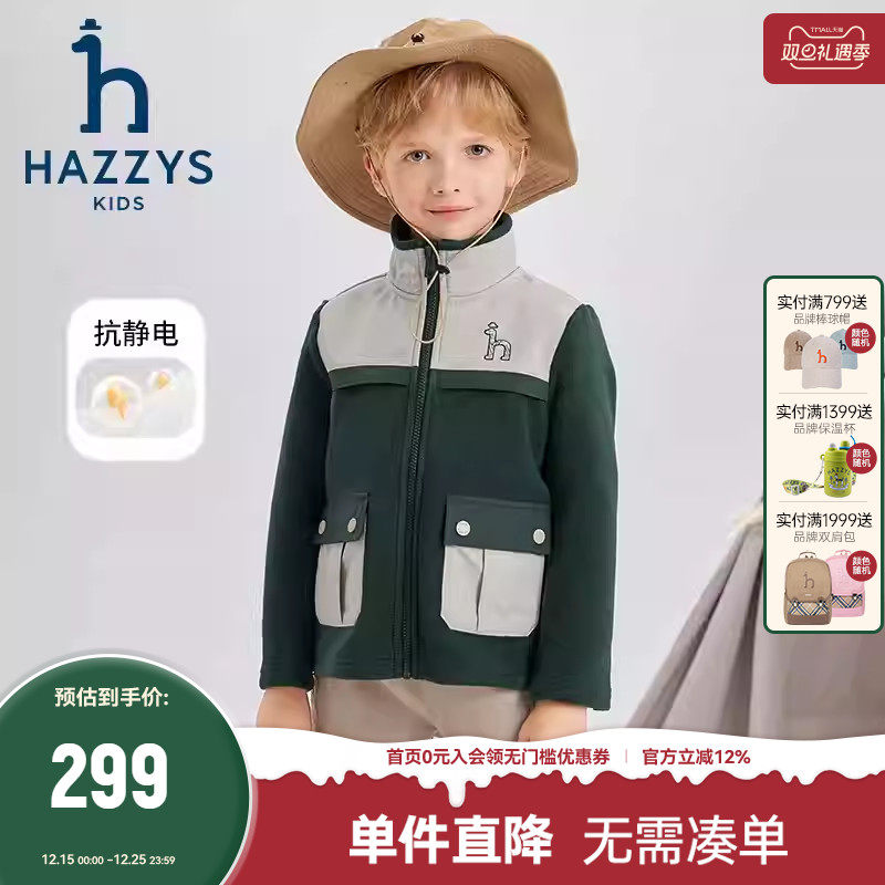 hazzys哈吉斯童装男童外套秋新中大童拼色抗静电立领保暖上衣