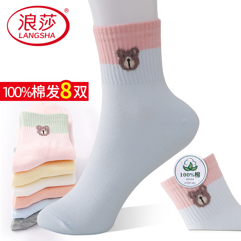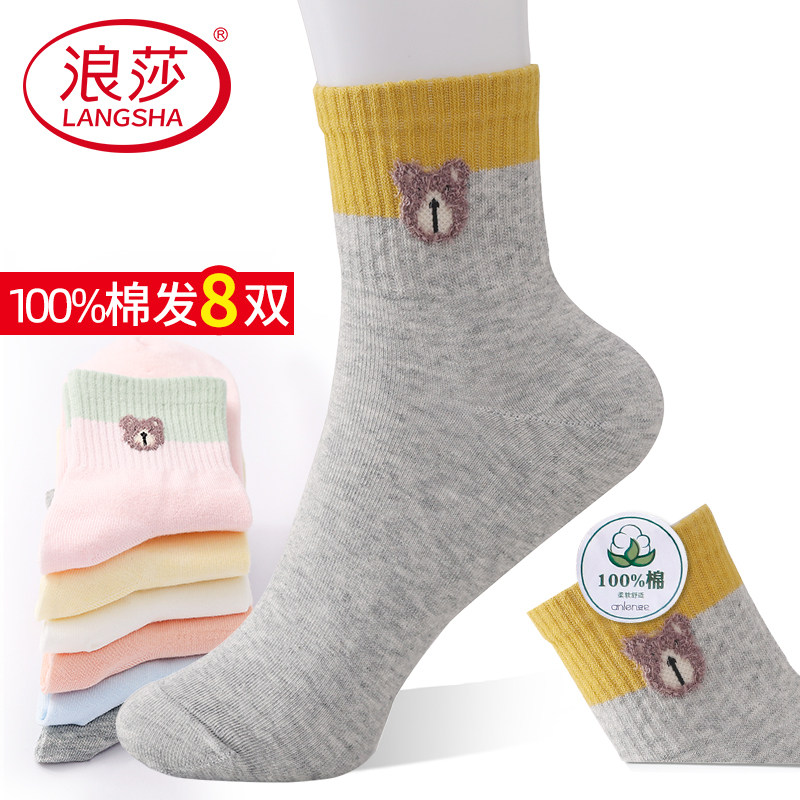 浪莎袜子女士纯棉春秋款短袜防臭吸汗中筒棉袜100%全棉女袜子四季