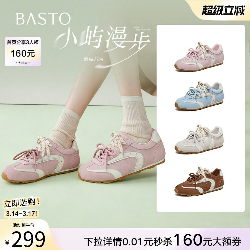 百思图2026春季新款真皮内增高粉色德训鞋运动休闲女鞋D3925AM6