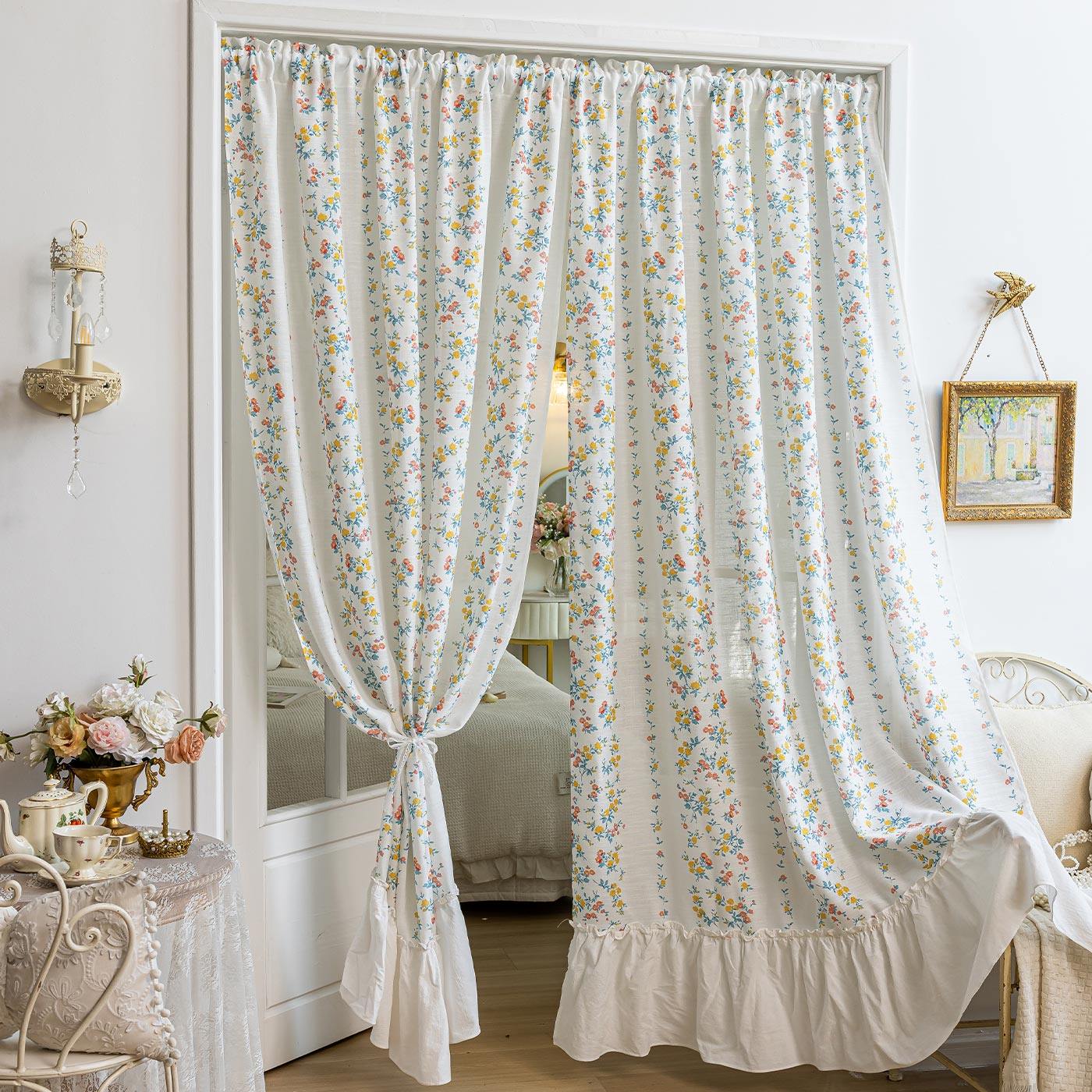 韩式碎花帘幔门帘隔断帘卧室房间家用免打孔纱帘透光不透人遮挡帘
