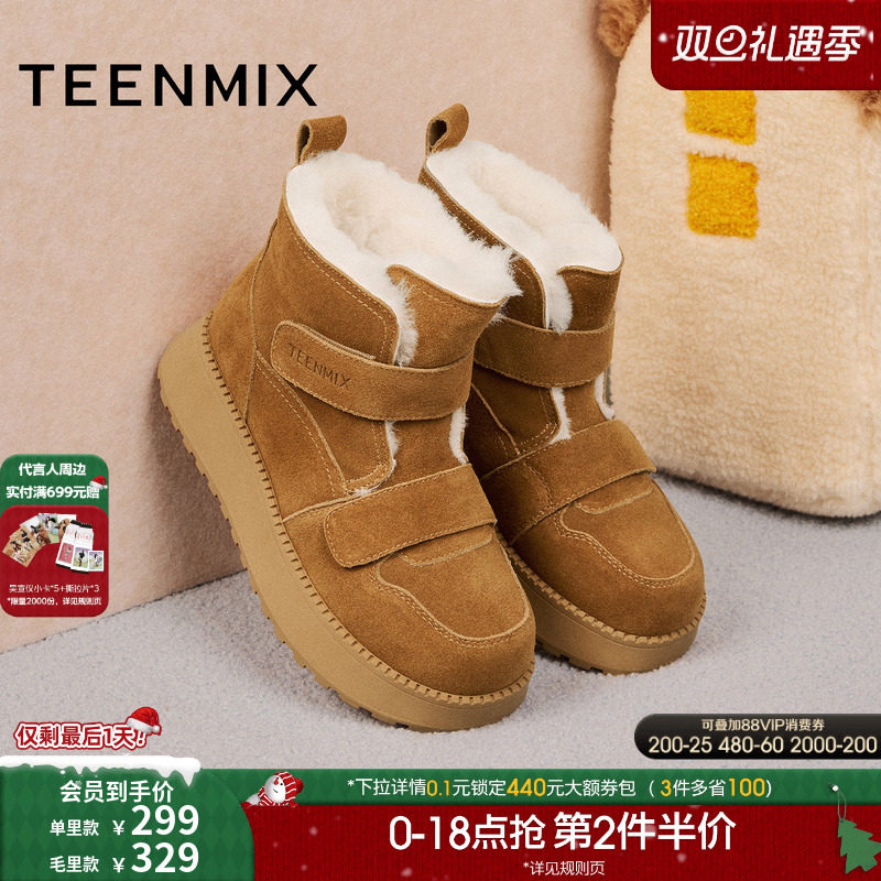 天美意复古厚底时装靴女鞋子加绒雪地靴棉鞋休闲短靴2025冬季新款
