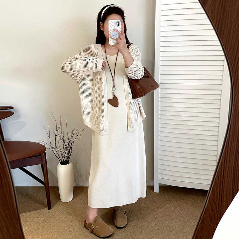大码女装镂空外套女内搭背心裙套装2025秋款胖mm针织两件套23286