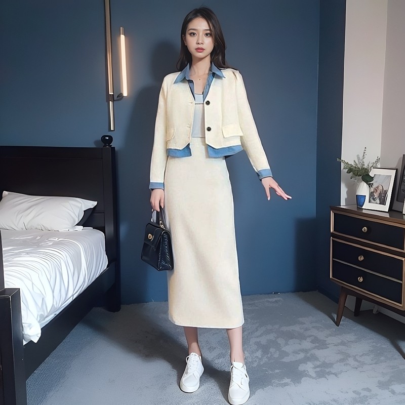 DONEED春秋款轻奢优雅小香风套装粗花呢加棉外套半裙两件套女