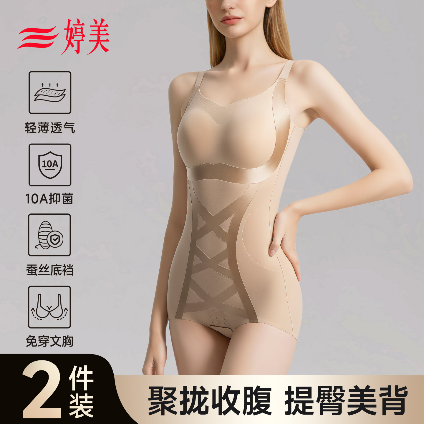 婷美塑身衣女收腹提臀塑形聚拢托胸束腰显瘦桑蚕丝里裆美体塑身衣