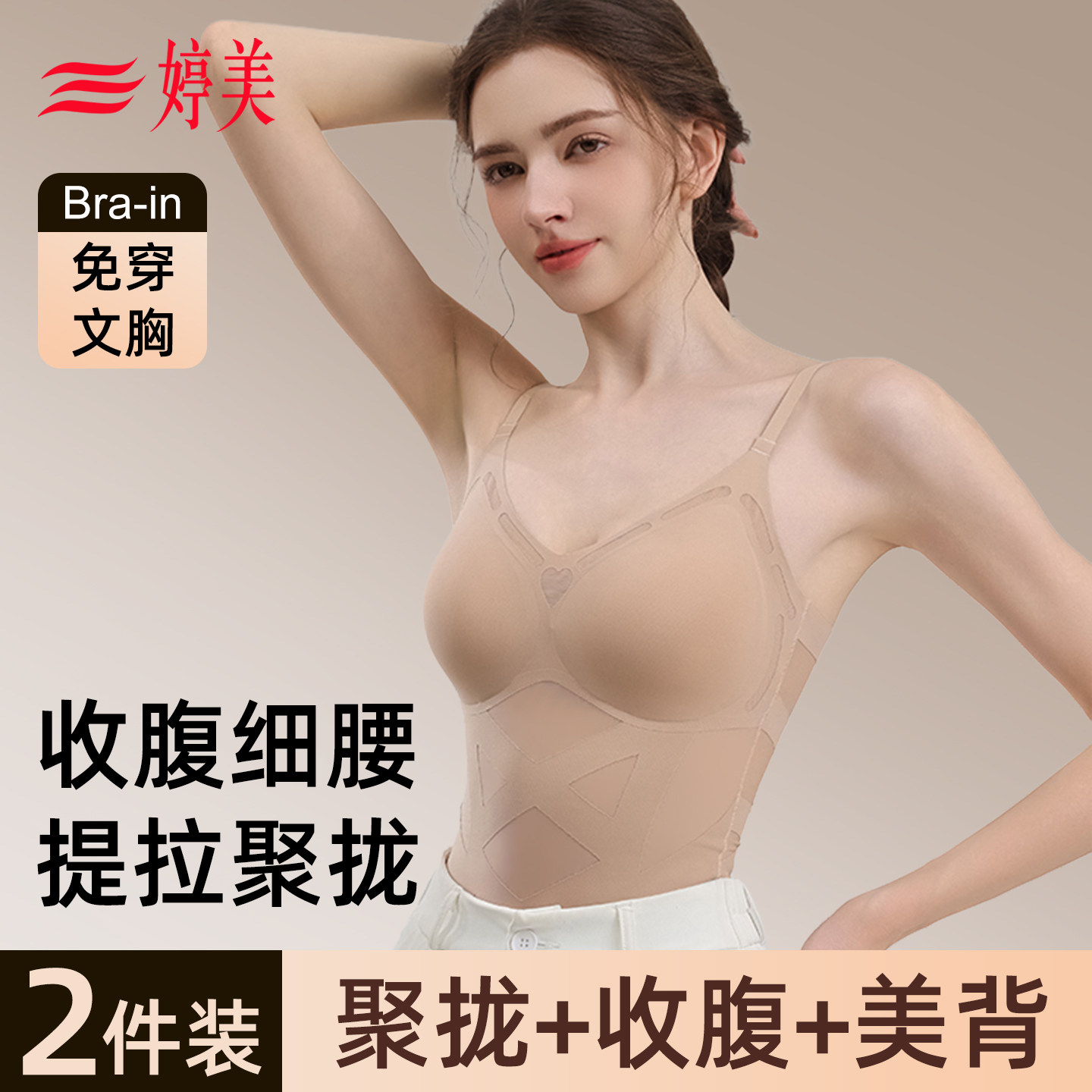 婷美塑身背心女显瘦小肚子收腹塑型挺背美体束腰罩杯一体吊带上衣