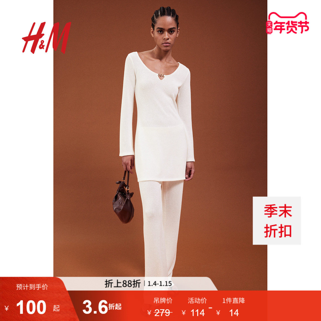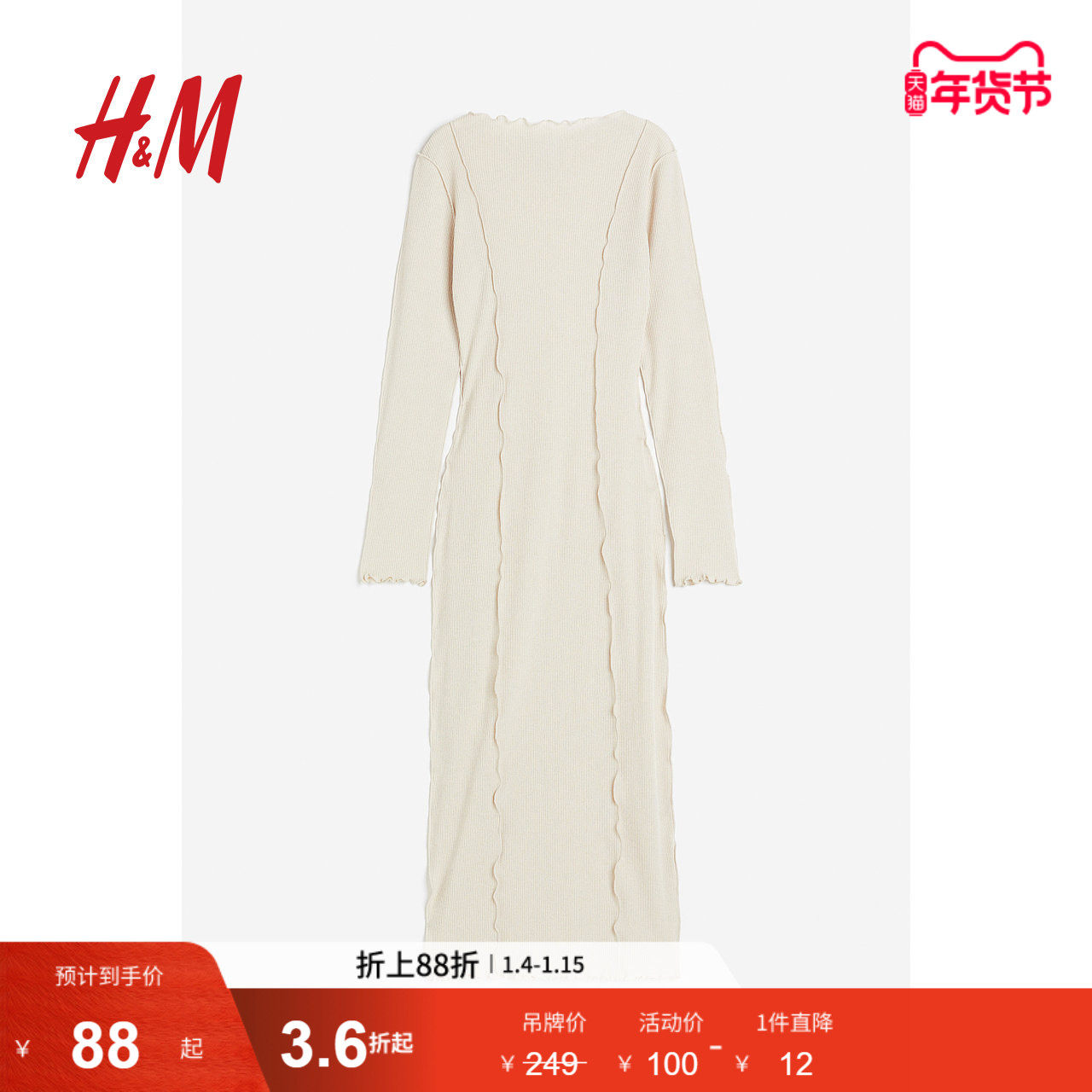HM女装连衣裙冬季罗纹针织露肩春节氛围感连衣裙1316024