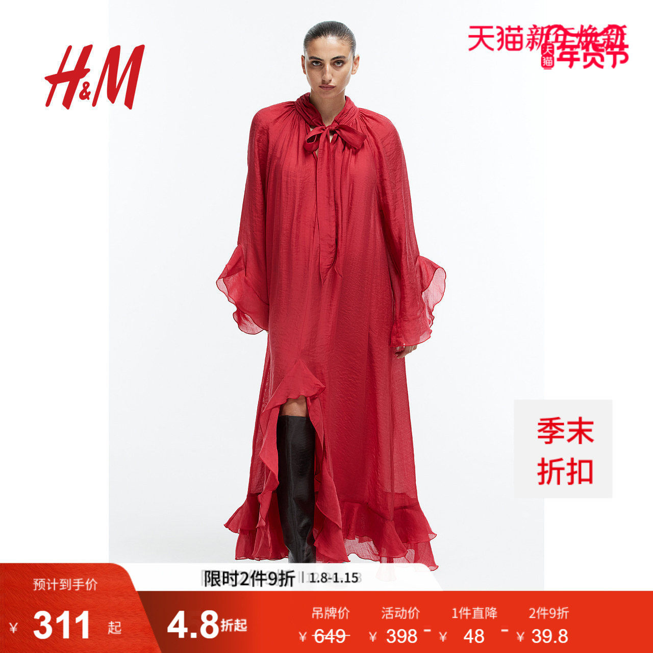 HM女装连衣裙冬季领口蝴蝶结系带荷叶边气质长裙1262490