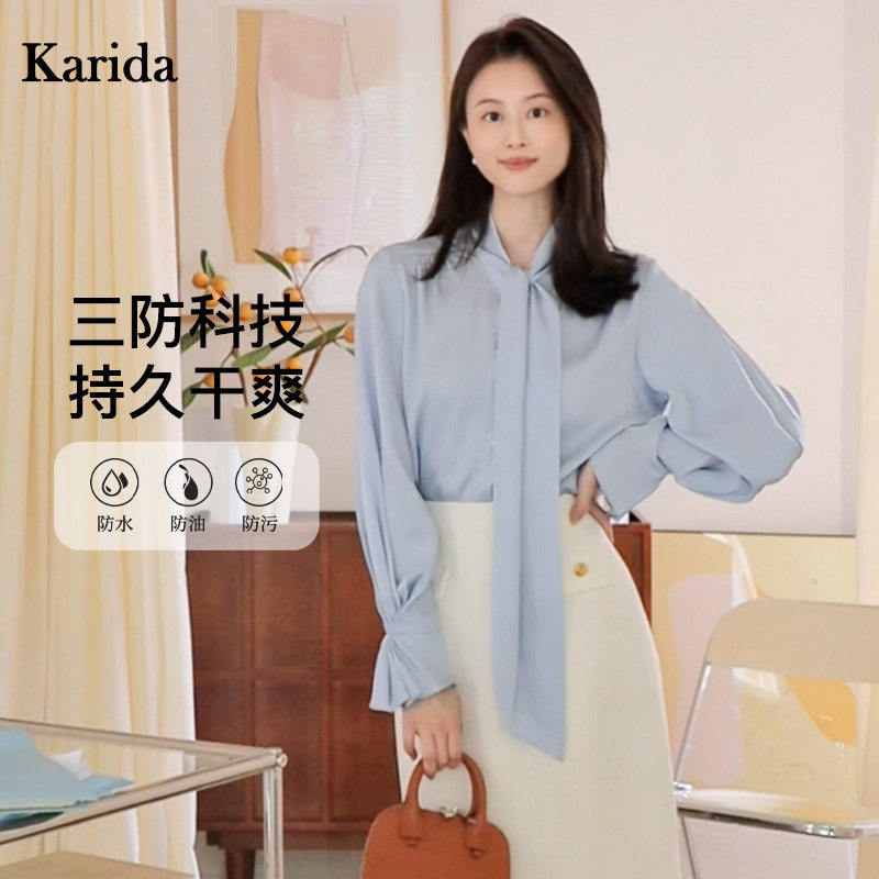 珂芮达【南枝】春秋新款飘带花苞袖桑蚕丝衬衣女长袖蓝色衬衫上衣