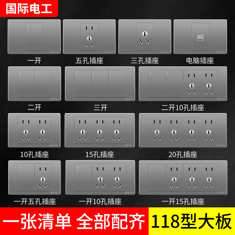 国际电工灰色118型开关插座面板墙壁家用厨房6孔9九孔十二孔多孔