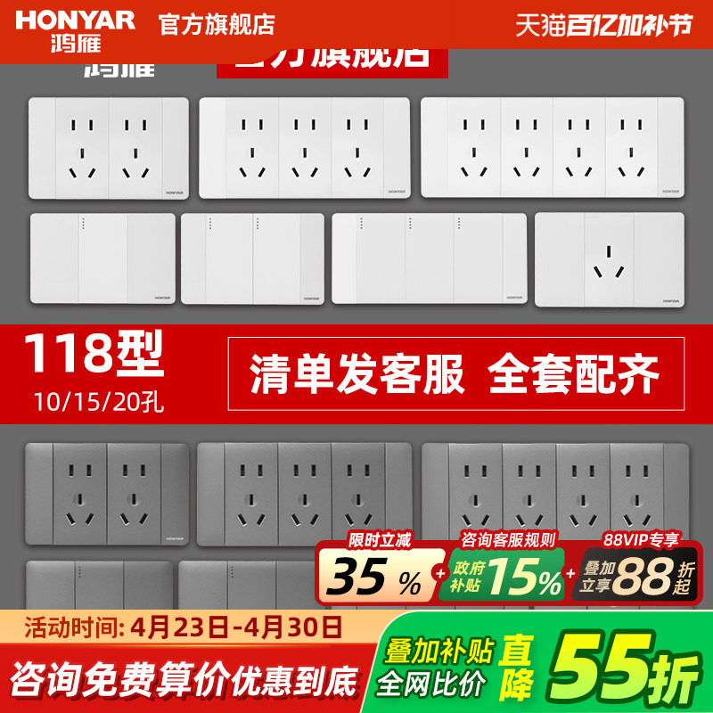 鸿雁官方旗舰118型开关插座面板五孔墙壁6孔九孔十二孔多孔Q118白