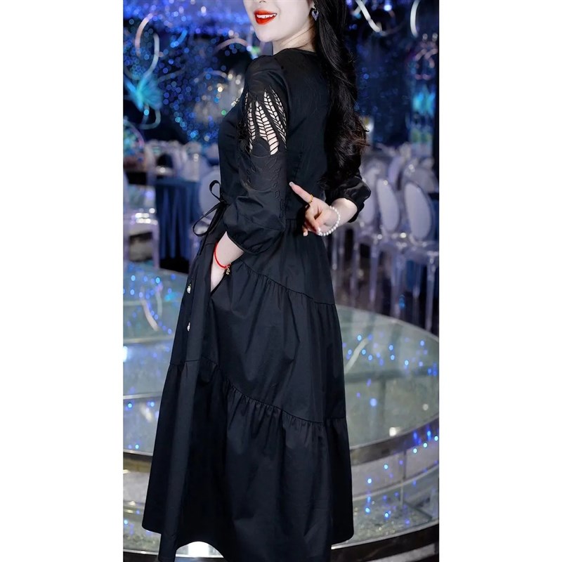 高级感大码女装春秋七分袖黑色丝绒拼接钉珠亮片网纱连衣裙长胖MM