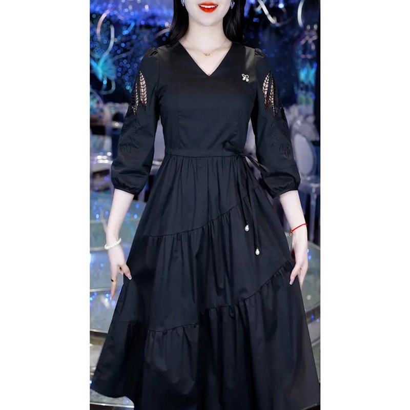 2025早春新款大码七分袖连衣裙女气质v领镂空收腰显瘦中长款裙子