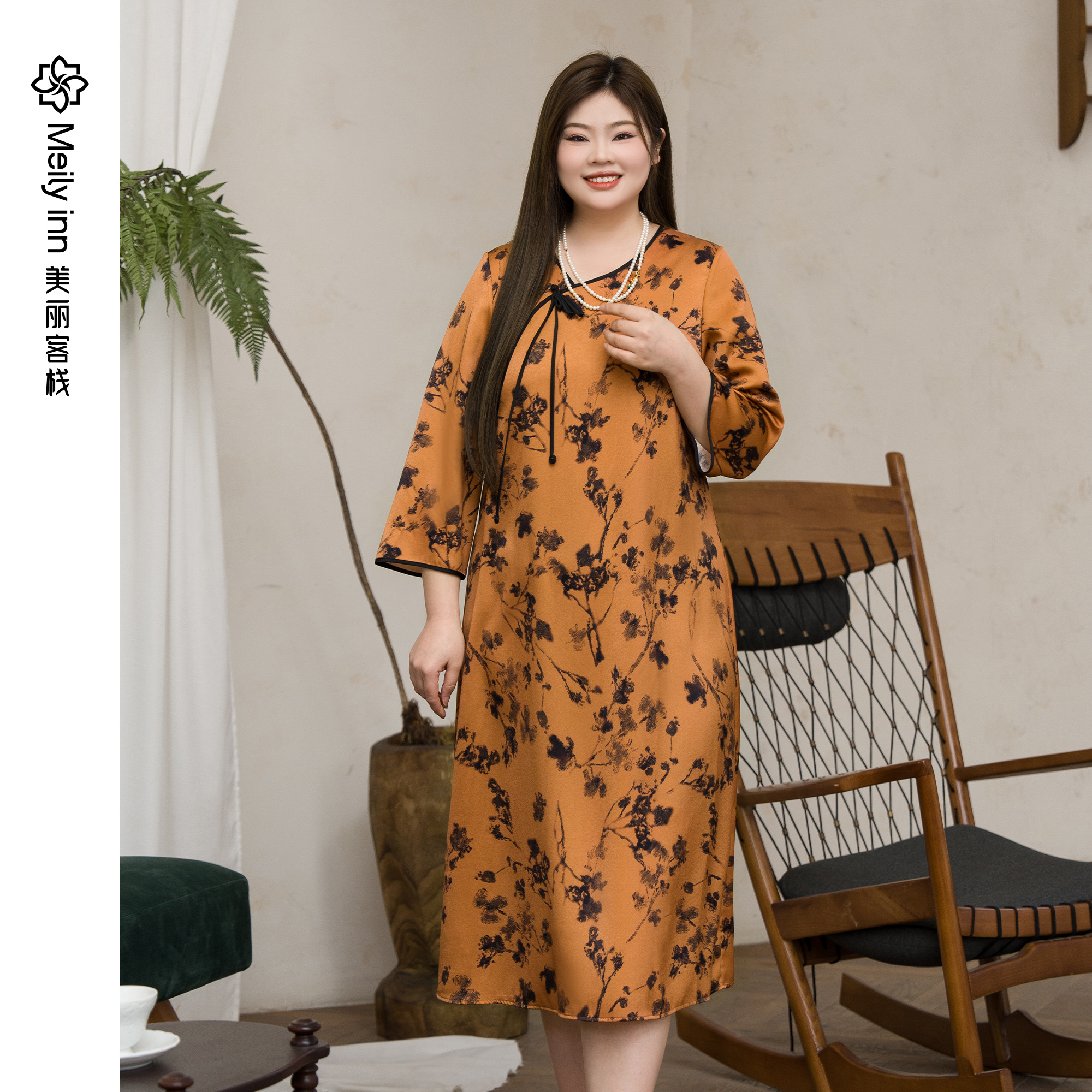 美丽客栈原创高端大码女装胖妹妹mm缎面丝滑印花七分袖连衣裙夏季