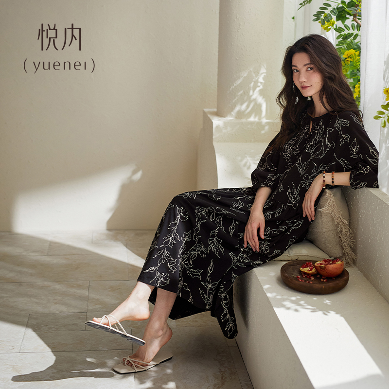 悦内睡裙女睡衣春秋款秋季七分袖纯棉大码宽松长款优雅黑色连衣裙