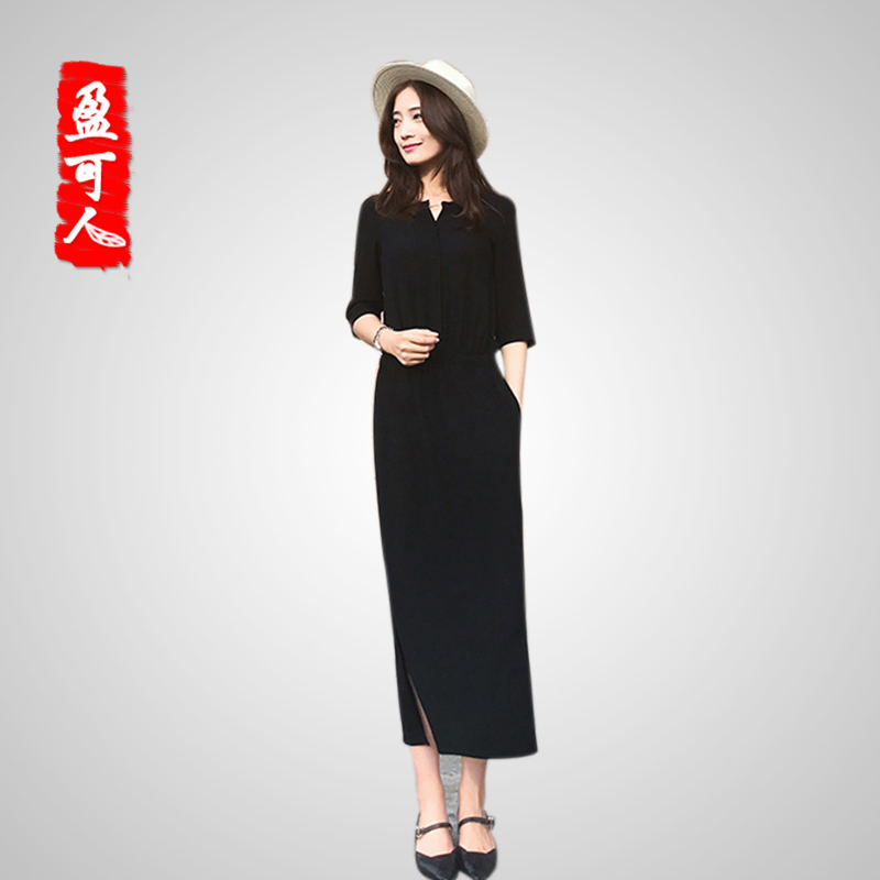 大码纯色高端女装春秋冬夏七分袖直筒宽松弹力遮肚口袋中长连衣裙