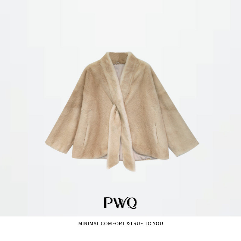JANEONESS 环保皮草仿水貂毛蓬松保暖半高小V领廓形连肩皮草外套