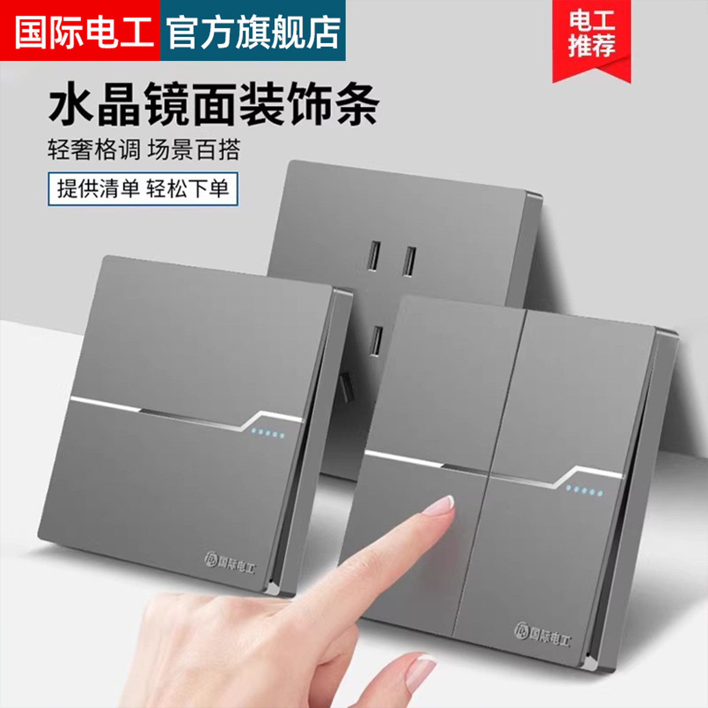 国际电工有机玻璃镜面家用86型一开单控带五孔开关插座面板暗装