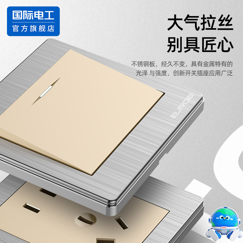 国际电工官方旗舰店86型拉丝金暗装墙壁一开五孔开关插座面板多孔