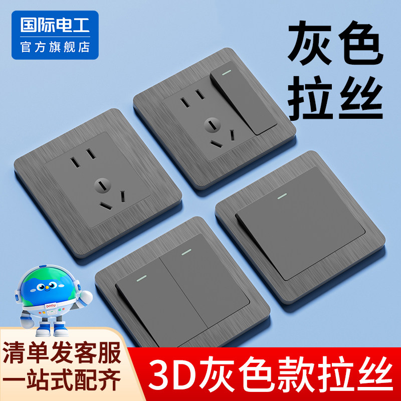 国际电工拉丝灰色五孔开关插座面板86型暗装16A三孔电源插座七孔