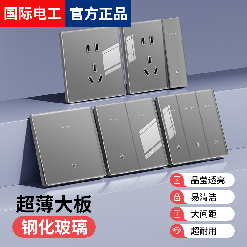 国际电工86型钢化玻璃灰色家用暗装墙壁电源一开五孔开关插座面板