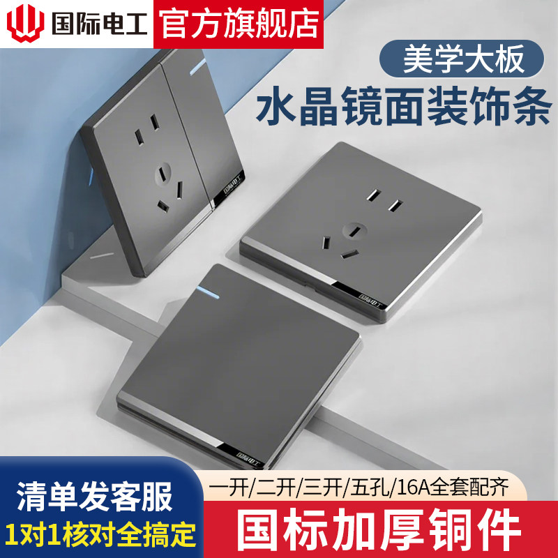 国际电工86型暗装大板灰色家用墙壁电源一开五孔开关插座面板多孔