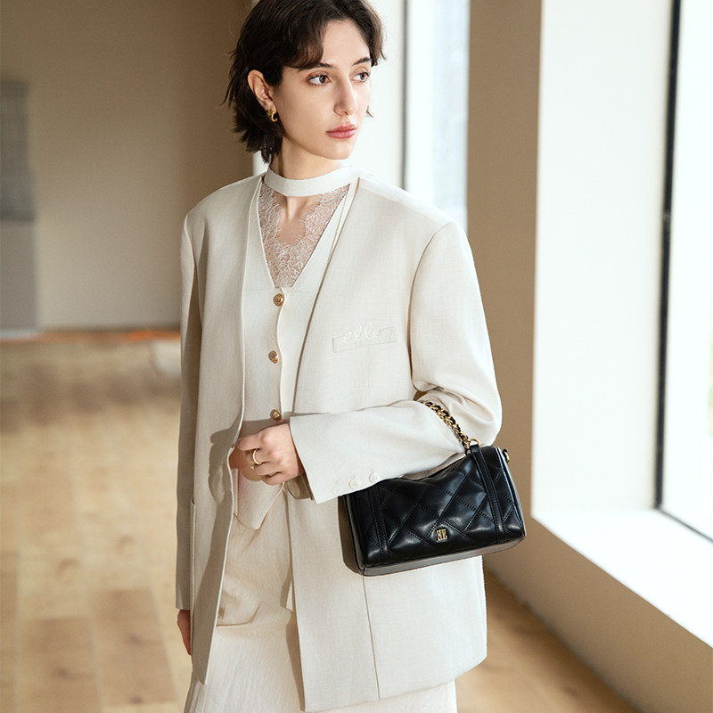 38节礼物ELLE女包菱格纹黑色手提包小香风时尚斜挎通勤链条单肩包