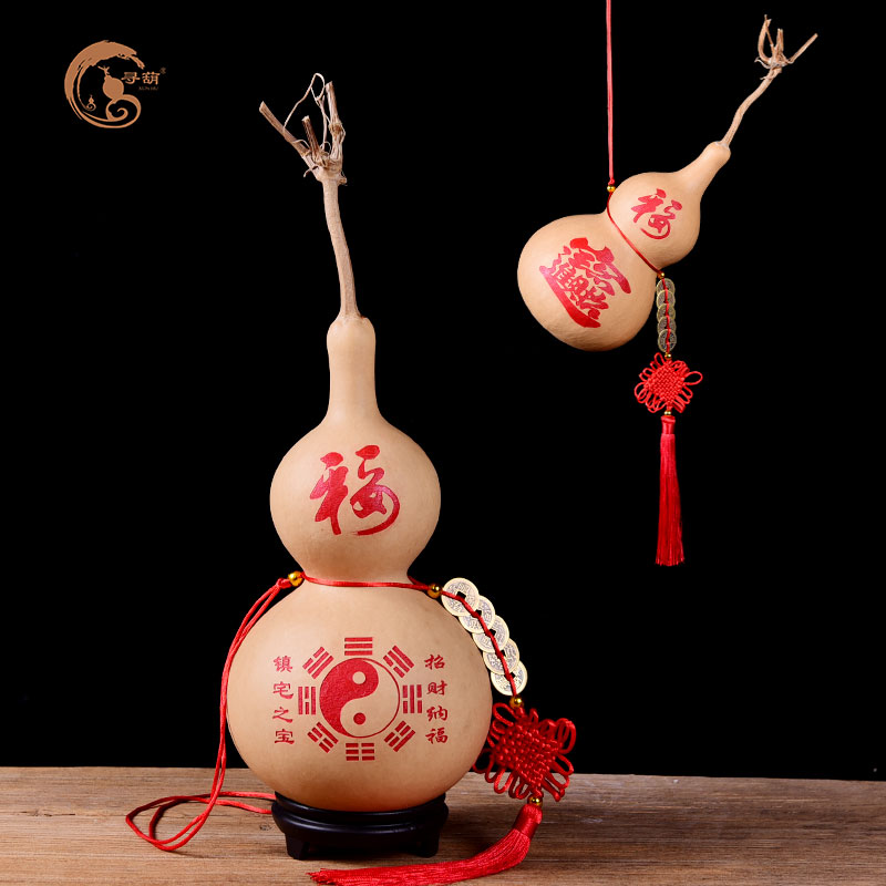 天然葫芦客厅开口大葫芦摆件小葫芦挂件雕刻八卦带龙头五帝钱葫芦